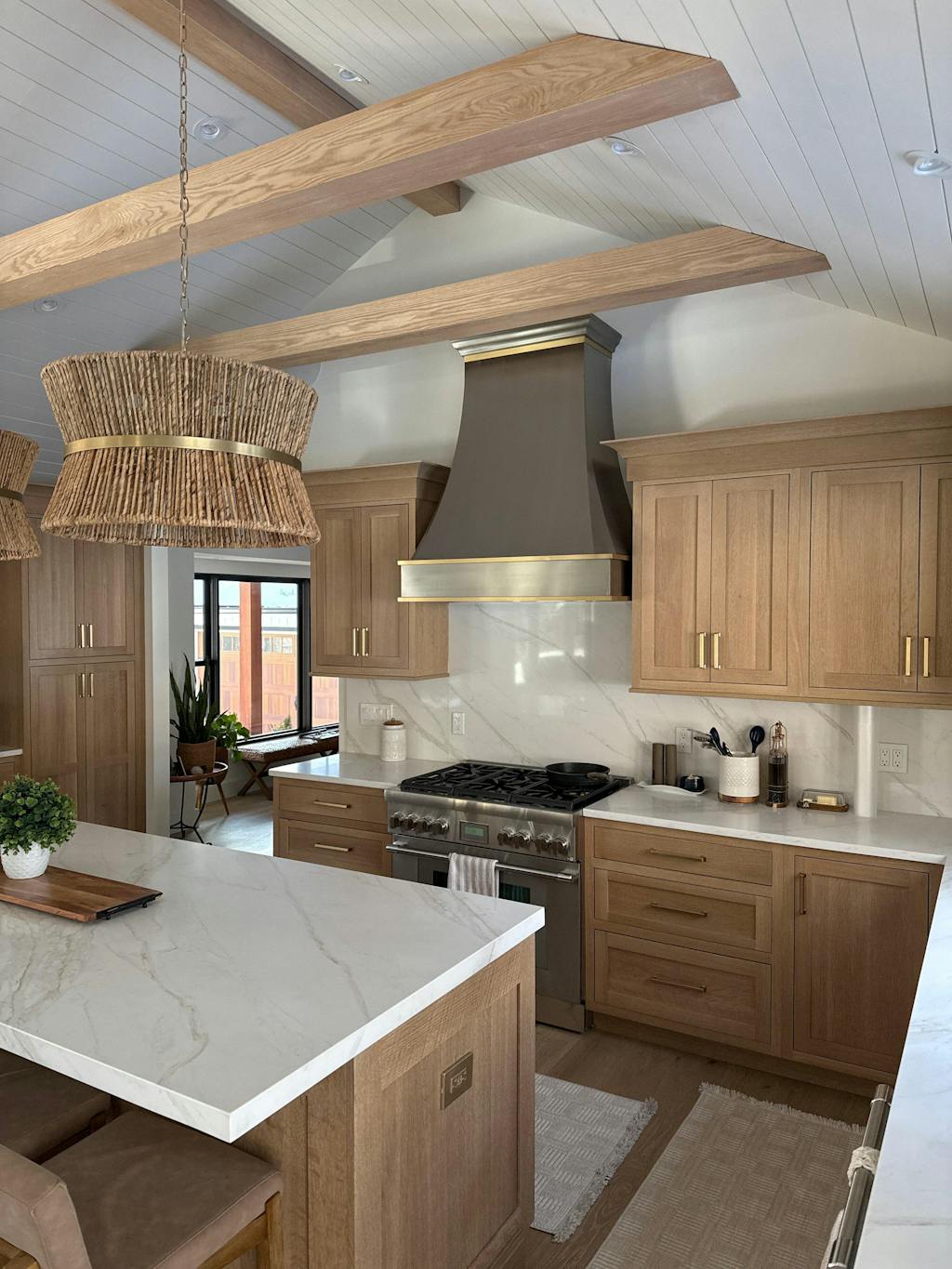 ISLAND MOUNT CUSTOM RANGE HOOD:Finished on 4 sides and hanging from the ceiling above the island.